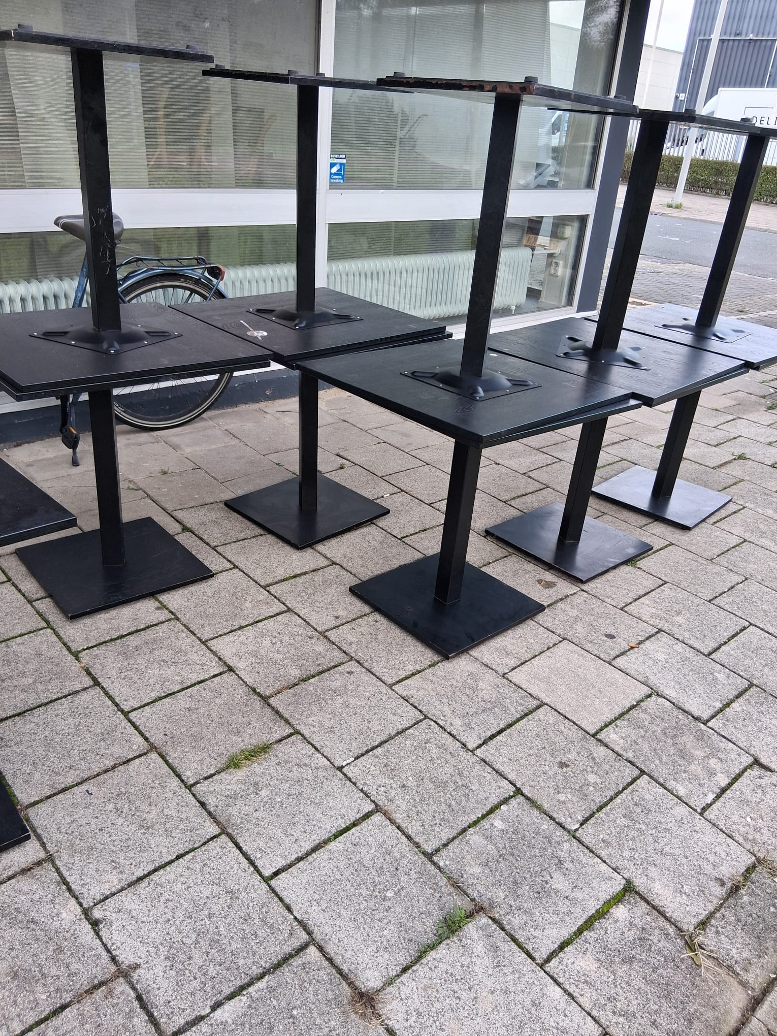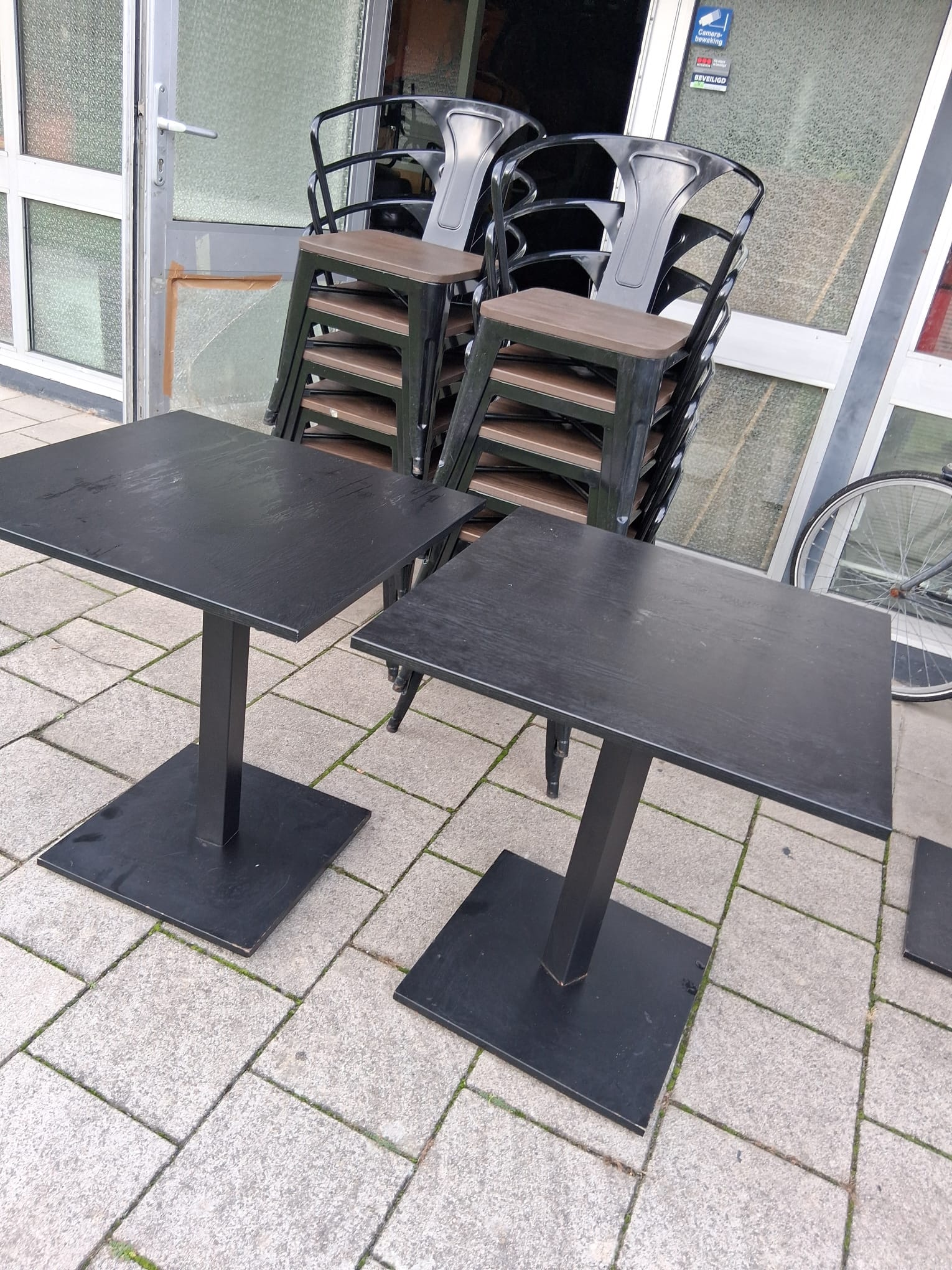 12 Zwarte tafels met houten blad 60x60cm