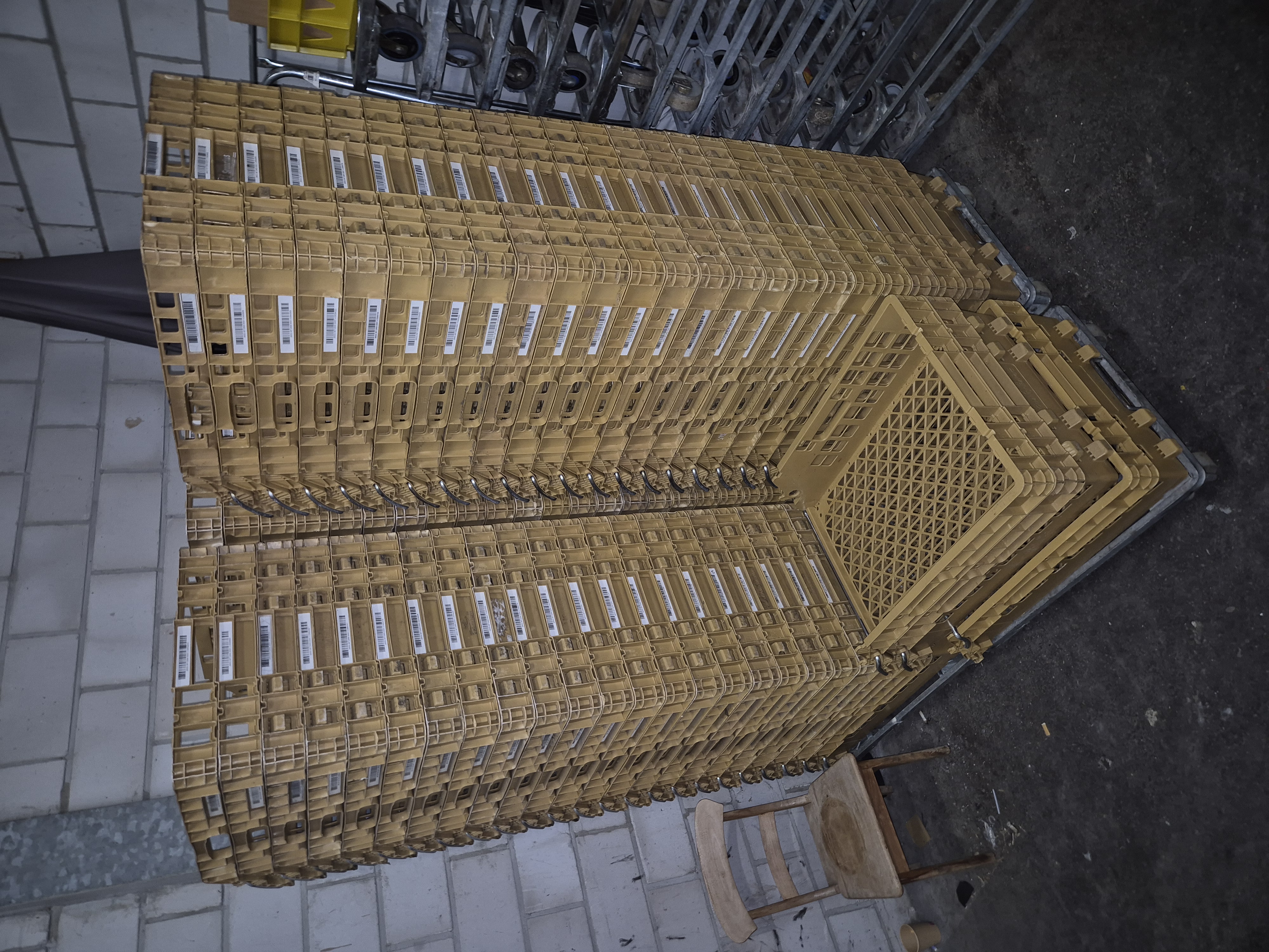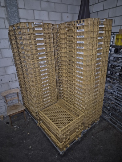 Grote partij broodkratten van 100 stuks op kar